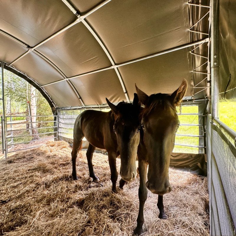 Parce que notre système de tension de la bâche est basé sur des cordes élastiques (extenseurs), qui maintiennent la bâche correctement tendue à tout moment, quelle que soit la température extérieure. La bâche de l’Abri pour le bétail reste ainsi constamment tendue, ce qui empêche la formation de cavités et l’accumulation d’eau et de neige dans celles-ci. Le confort d’utilisation et la durabilité s’en trouvent considérablement améliorés.
