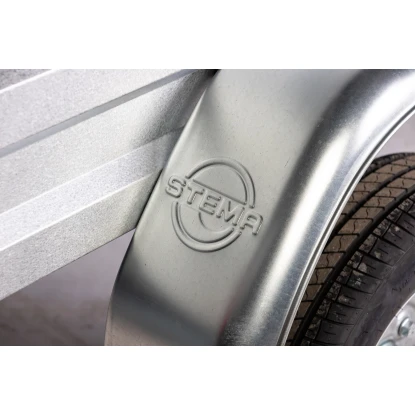Le revêtement spécial aluminium-zinc (Galvalume®) des ridelles et le châssis galvanisé à chaud garantissent une grande insensibilité aux intempéries. Toutes les remorques Stema sont équipées de timons en V comme caractéristique de sécurité supplémentaire.