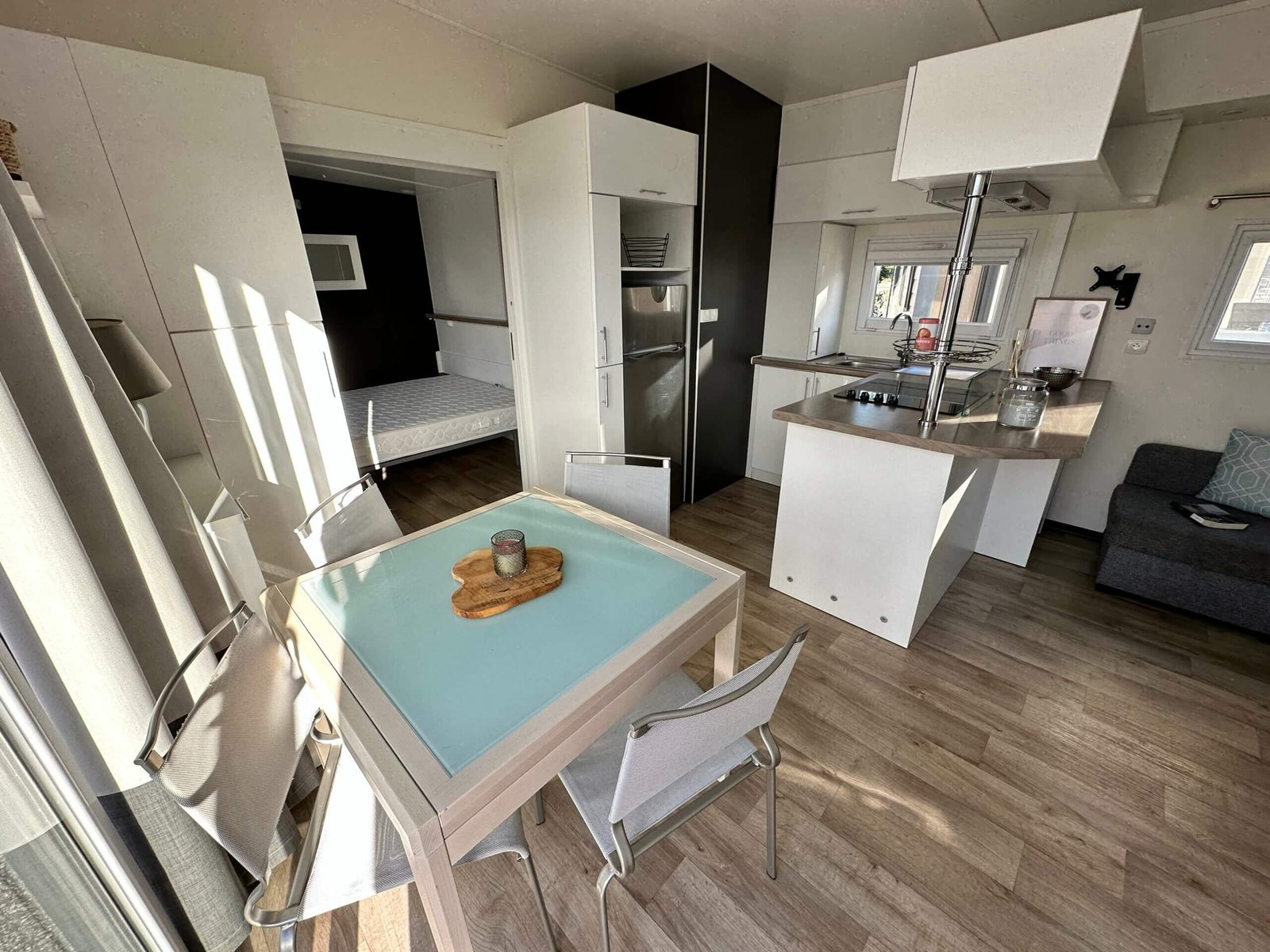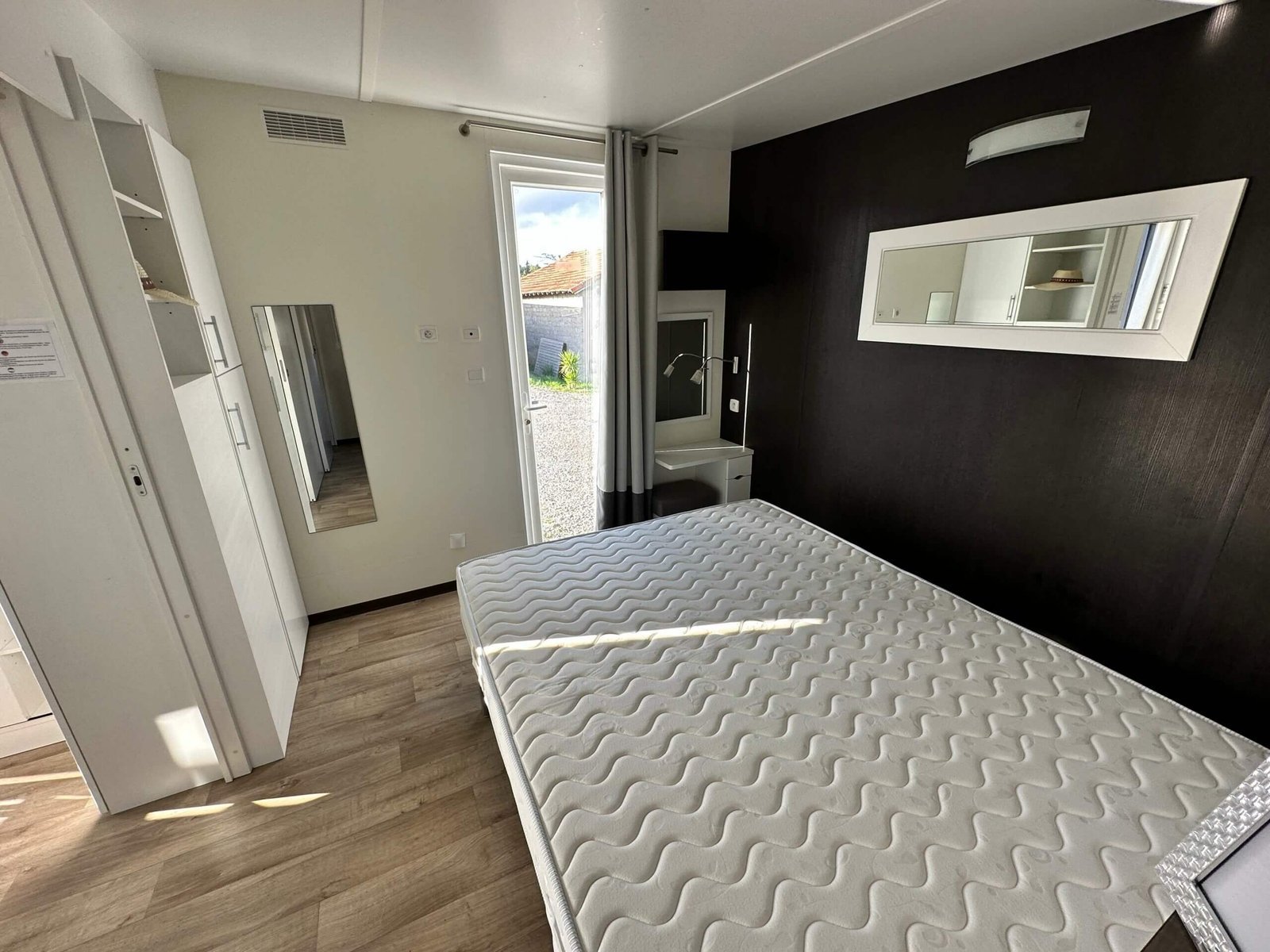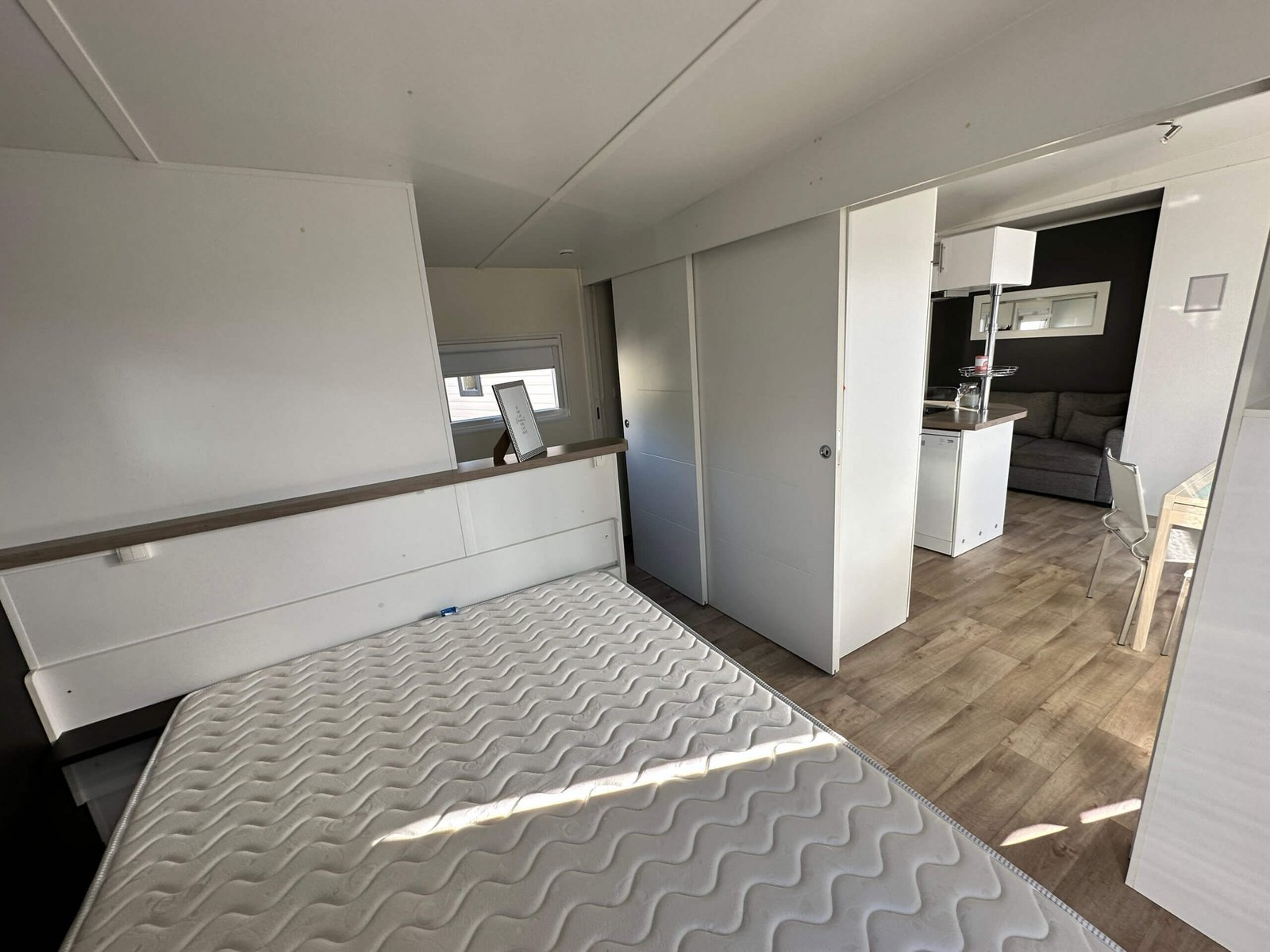 Les portes coulissantes, et sa baie vitrée à galandage vous offre une belle luminosité dans la pièce de vie. La chambre parentale possède une porte vitrée donnant un accès direct sur lextérieur.