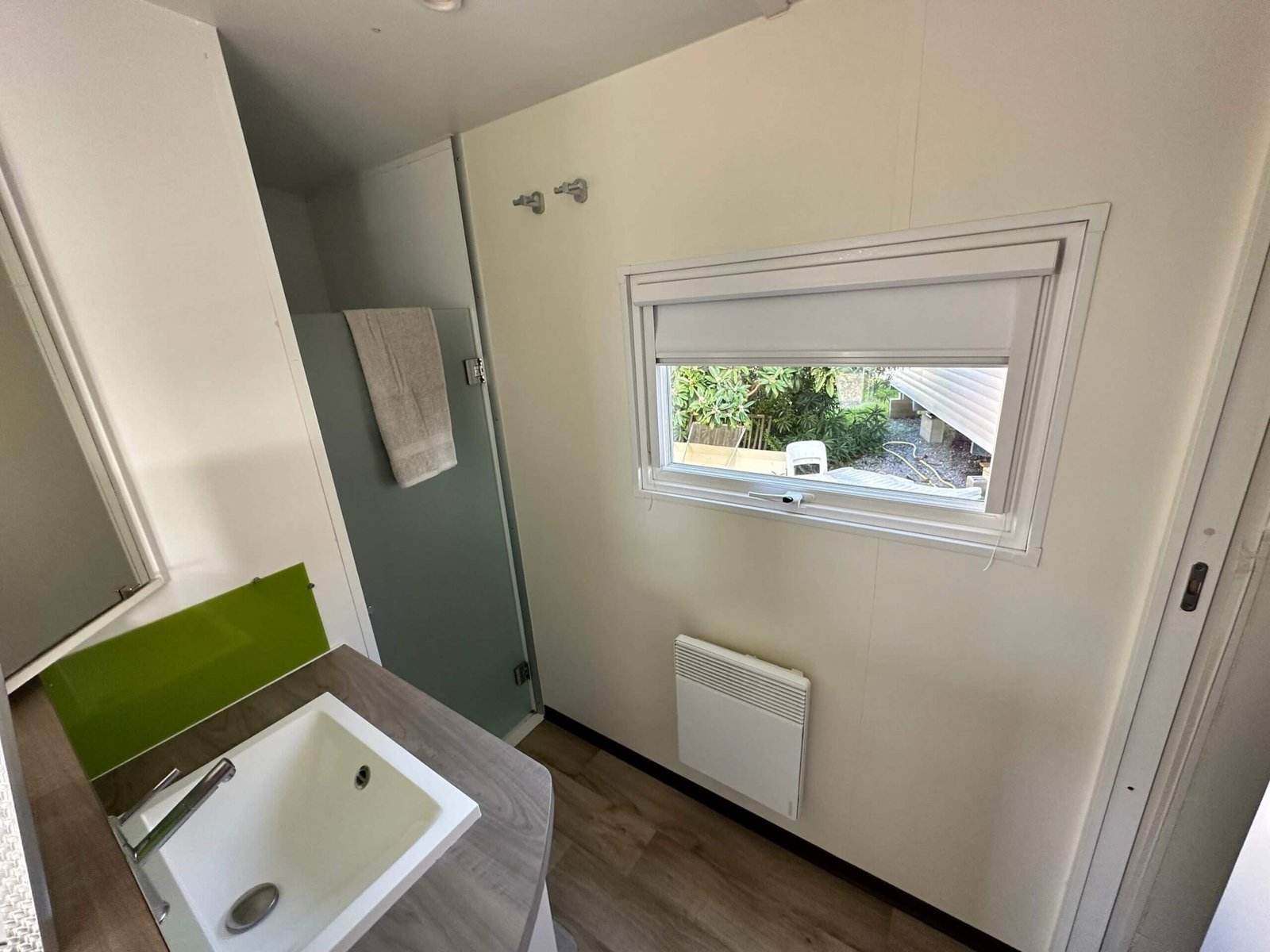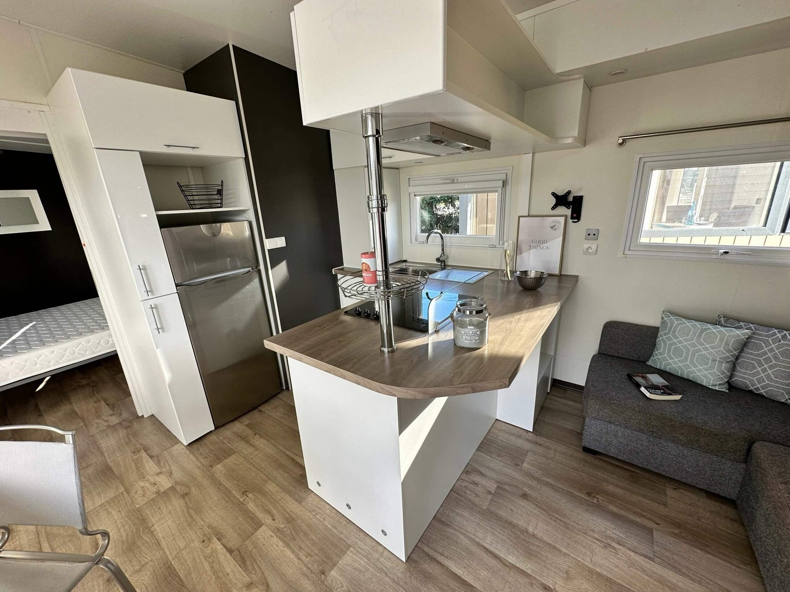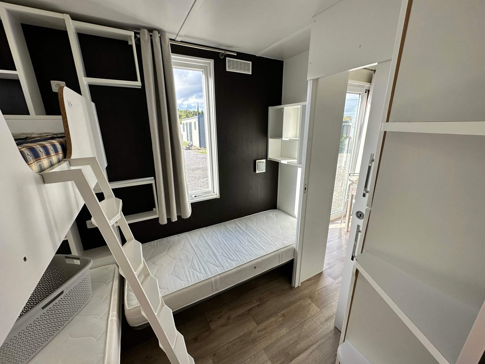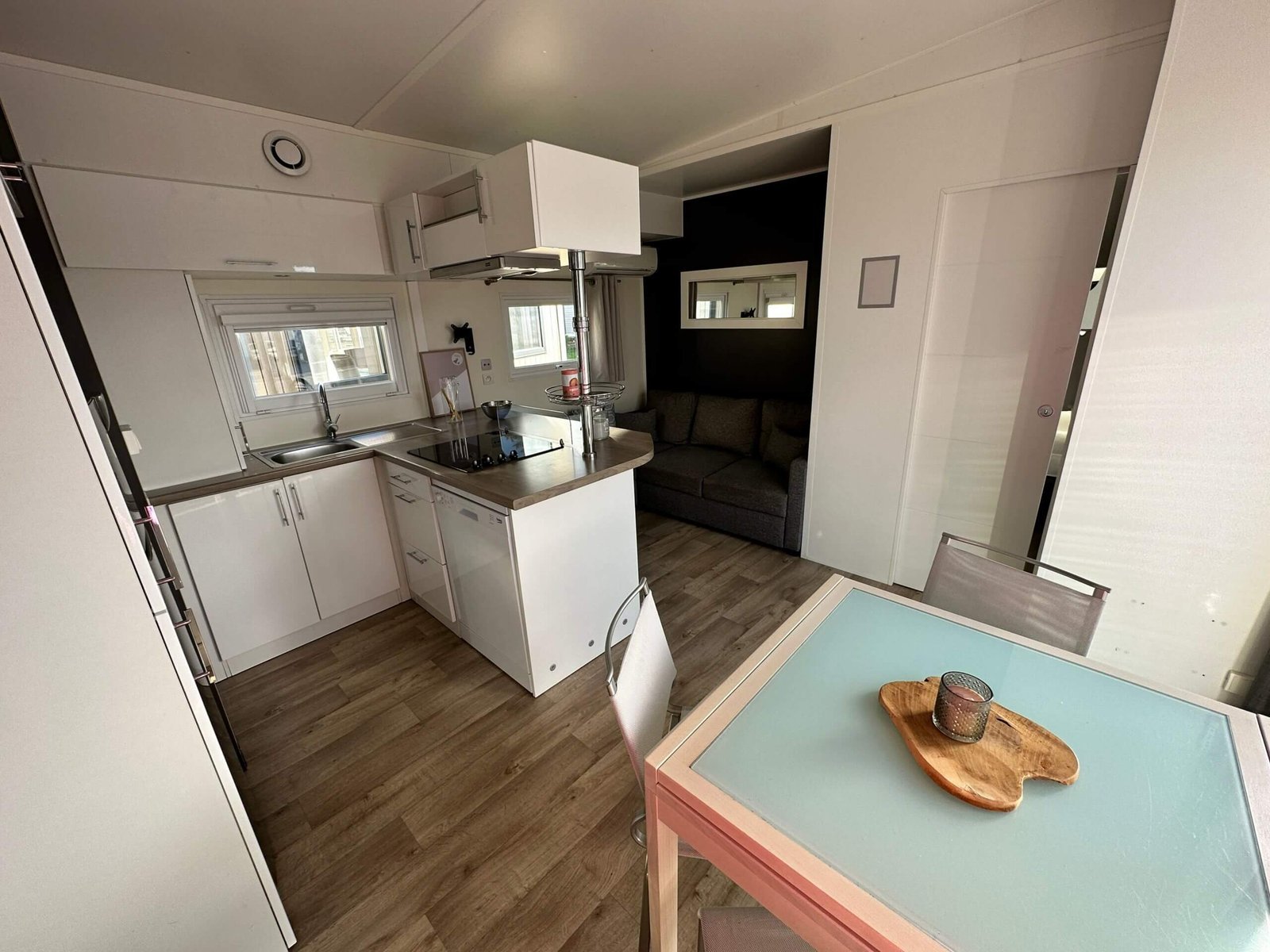 Les portes coulissantes, et sa baie vitrée à galandage vous offre une belle luminosité dans la pièce de vie. La chambre parentale possède une porte vitrée donnant un accès direct sur lextérieur.